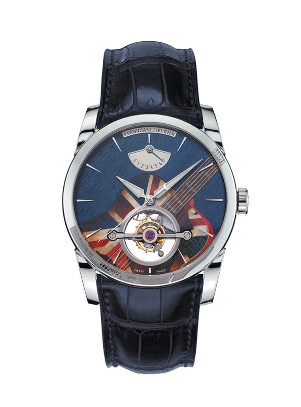И главным отсылом к ритмам зажигательной бразильской музыки стал циферблат с изображением гитары, выполненный в технике маркетри. Надо сказать, схожий прием деревянной мозаики в виде гитары, в резонансном отверстии которой разместилась каретка турбийона, мы у Parmigiani Fleurier уже видели. Причем, видели совсем недавно: в представленных на SIHH 2013 моделях Tonda Woodrock – UK и Tonda Woodstock – USA. Но в корпусе Pershing из титана с ободком из розового золота, исполненный в цветах государственного флага Бразилии и с национальным лозунгом «Ordem e Progresso» («Порядок и прогресс»), венчающим изображение гитары, этот сюжет смотрится совсем иначе, более ярко и жизнерадостно. Разумеется, в Parmigiani озаботились и особенным ремешком для этой модели (традиционный кожаный ремешок Hermes здесь гармонирует с темно-синим цветом на циферблате), и «упаковкой»: для Pershing Samba Madeira была создана специальная коробка из дерева с ручной росписью в цветах национального флага Бразилии.
