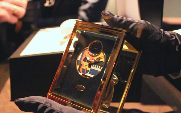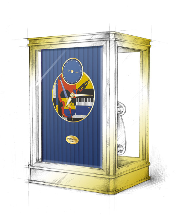 Еще один шедевр часового искусства в экспозиции марки Parmigiani - настольные часы с 15-дневным запасом хода Blue Note. Фирменный механизм PF920 обеспечивающий индикацию часов, минут, секунд и запаса хода, помещен в полированный корпус из позолоченного серебра с дверцами из граненого минерального стекла. В корпусе есть потайной ящик, который закрывается на ключ. На задней крышке выгравирован индивидуальный номер. Два циферблата: малый циферблат в виде деревянной мозаики маркетри, малый опаловый секундный счётчик, большой циферблат с декоративной обработкой «Côtes de Genève» и скошенными вручную углами. Стрелки в форме Delta с люминесцентным покрытием.