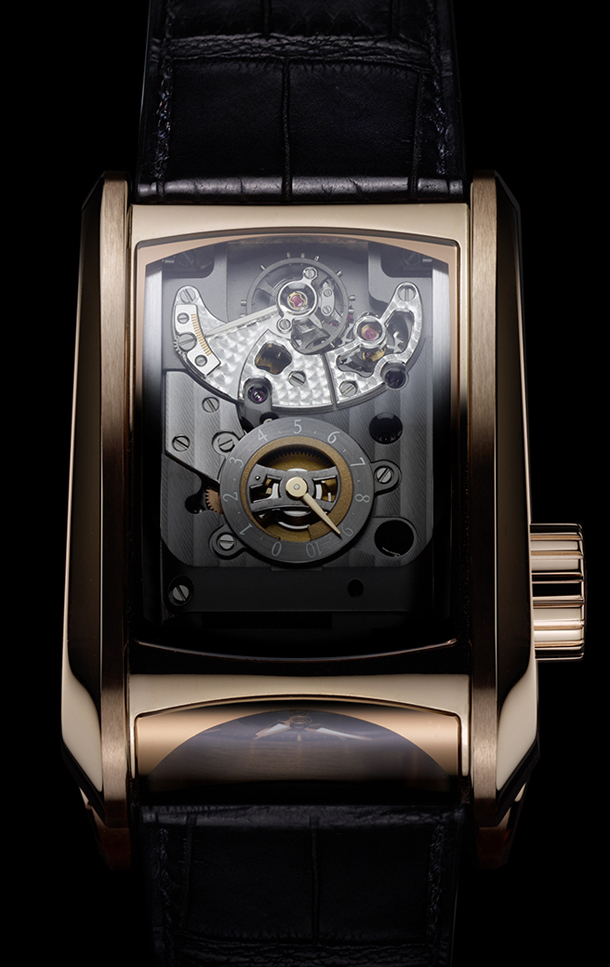 Данные часы исполнены на основе модели Toric Minute Repeater Capitole, уже три года существующей в коллекции Parmigiani Fleurier. Напомним, что первоначальная модель была создана на основе карманных часов начала XIX века Perrin Freres из коллекции фонда семьи Сандоз (FEMS). И тогда, и сейчас, мануфактурный калибр PF 321 (с ручным подзаводом и запасом ходя 42 часа) оснащен минутным репетиром с кафедральными гонгами и секторным указателем времени. Расположено секторное окошко из таитянского перламутра в верхней части циферблата (над или даже позади изображения горы Арарат), на нем красуются часовые метки из золота. Время в этой апертуре указывается по 60 минут с 5-ти минутной разметкой и метками, обозначающими четверти часа. Часы (от 1 до 12) появляются на циферблате в виде арабской цифры, которая медленно смещается от первой до шестидесятой минуты, уступая место следующей. Данный модуль установлен на вращающуюся систему из трех зубчатых колес с четырьмя рукавами, каждый из которых имеет на конце по цифре. Связанный непосредственно с часовым колесом, дисковый узел приводится в движение с помощью системы кулачков, которые каждый раз заставляют появляться следующий час, когда предыдущий заканчивается свой путь.