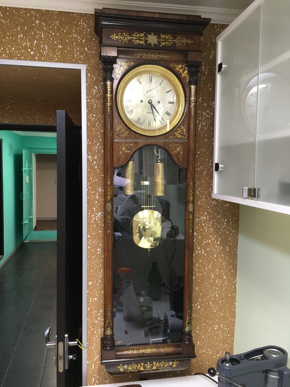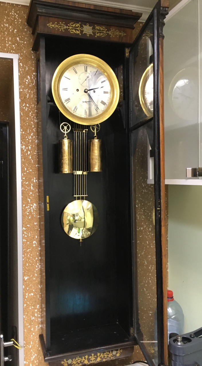 вообще, все внешние латунные детали когда-то щедро натирались пастой Гои, и эта зеленая масса была и на циферблате с безелем, и на стержнях маятника -пришлось разбирать, мыть и полировать