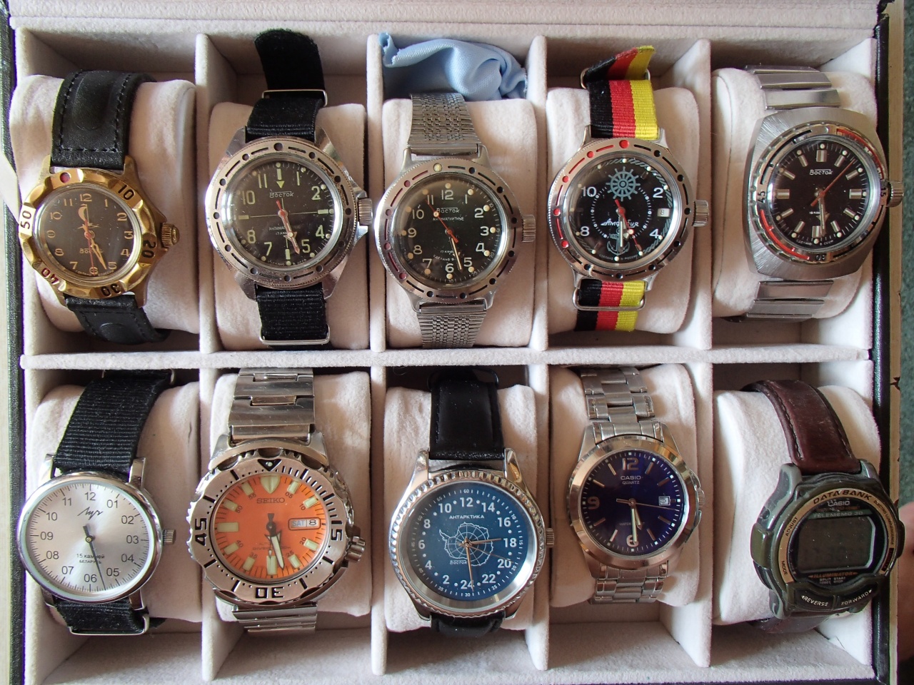 G-shock 4 шт, seiko оранжевый монстр, командирские с амфибиями кучка, какие то Casio в ассортименте, suunto zoop, Корабельных больше 20 штук, Barigo 4km, луч-манометр, восток-24, К-43 номер 86. 2 сына и хонда цивик, молнии карманные, 2,5 штуки