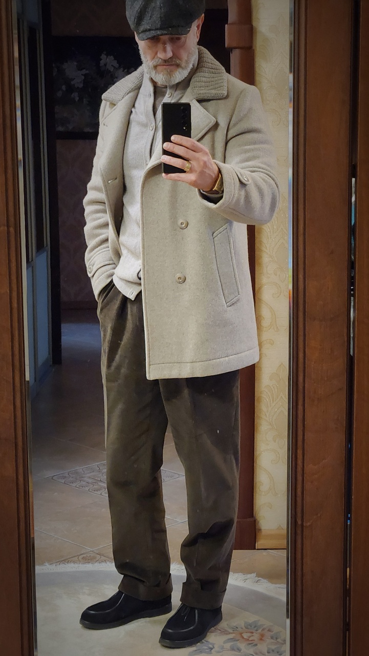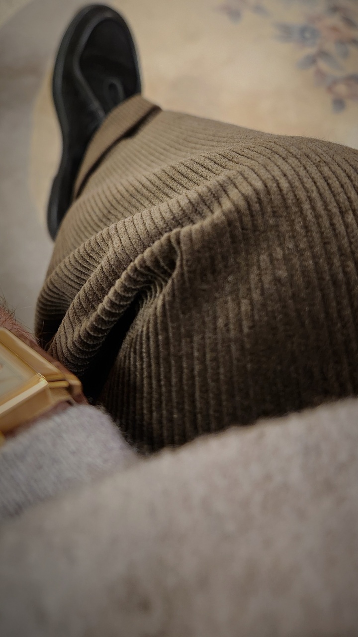 Узкие длинноватые штаны плотной х/б фактуры дали сборку изломами и гармонью, что не может смотреться гармонично. Для казаков (сапог) вид бы был нормальный. для цивильного вида - нет. Укороченная штанина оттягивает вниз все сборки и нога смотрится более стройной. Вид более выигрышный.