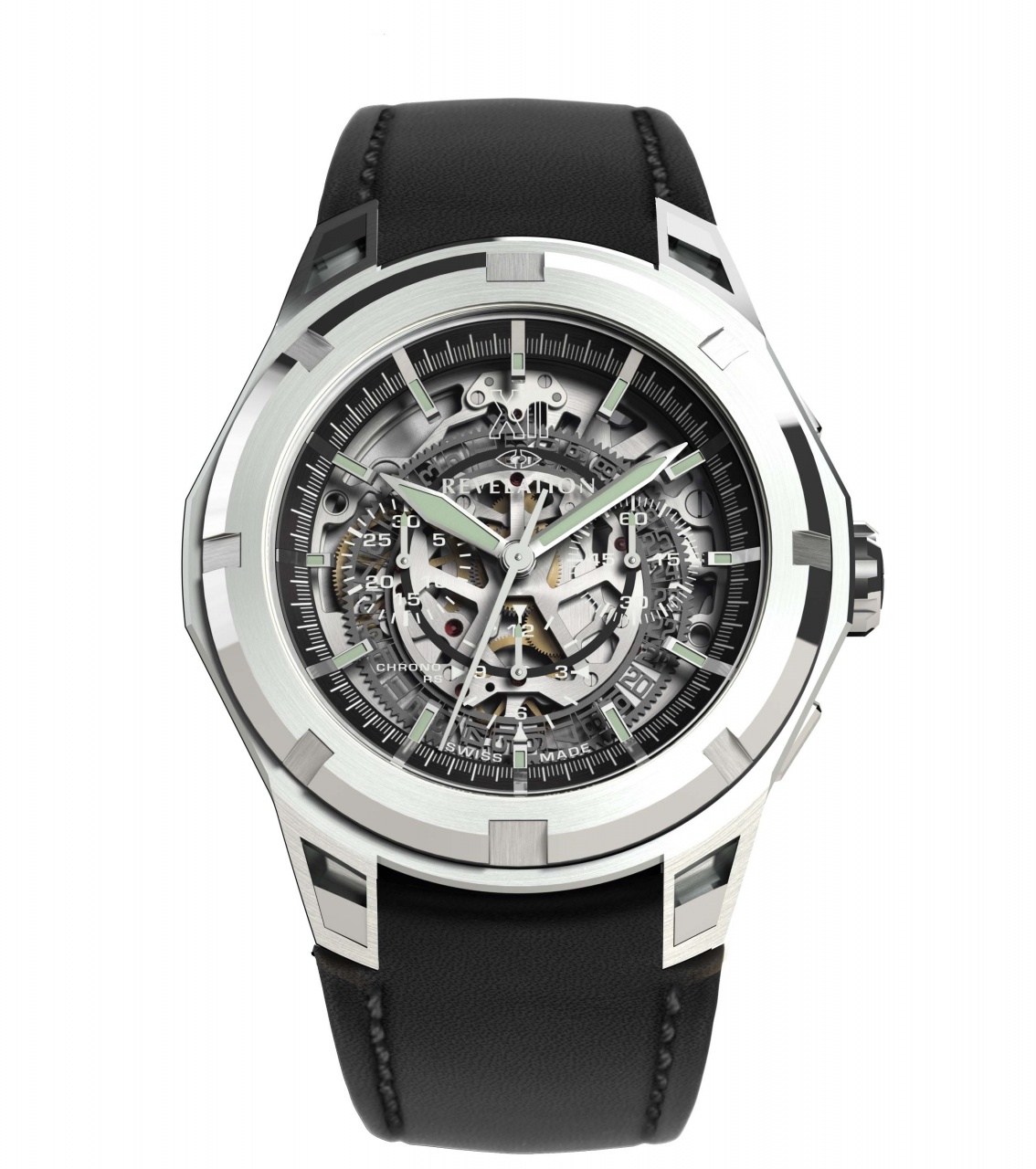 Новая модель R03 Chronographe RS от швейцарской часовой компании REVELATION отличается тем, что на передней стороне корпуса расположены два диска из поляризованного стекла, которые располагаются друг на друге, образуя циферблат (причем, каждый диск покрыт трехмерной наноструктурой в виде пластины, толщиной около 70 нанометров). С помощью специального запатентованного механизма (который состоит из червячной системы и сложной коробки передач), эти диски вращаются, причем поворот на девяносто градусов (посредством зубчатого безеля) в одну сторону превращает их в совершенно прозрачные, делая видимым часовой механизм, а в другую сторону - затемняет циферблат, превращая его в матово-черный. Указанная система поляризационных дисков была разработана брендом совместно с Centre Suisse d’Electronique et de Microtechnique в 2007-2008 годах. Это сотрудничество продолжается и в настоящее время, что позволило сделать в дисках три выреза под оси малого бокового циферблата и двух счетчиков хронографа.