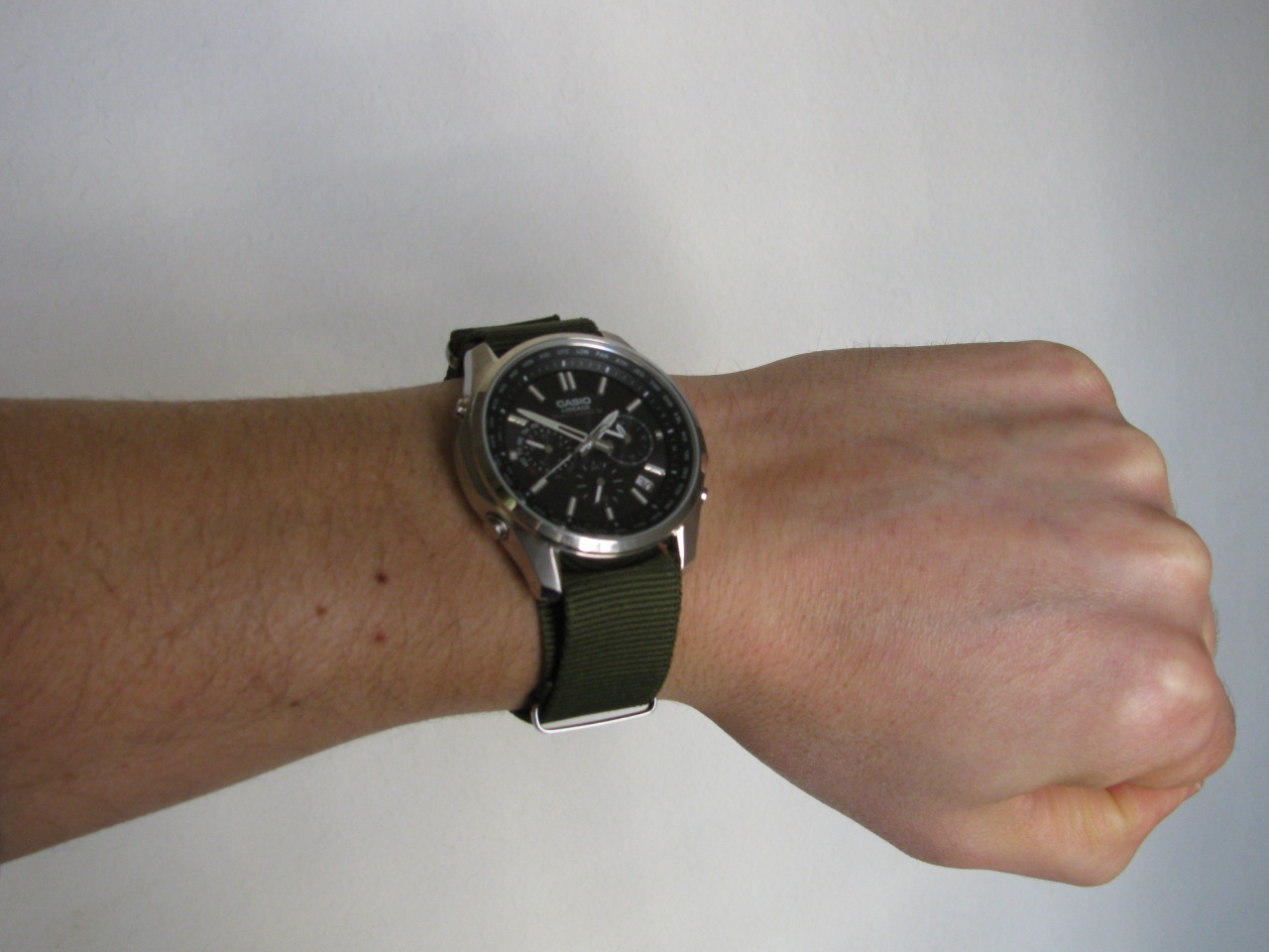 Не сложилось у меня в жизни с браслетами, поэтому первым делом поиграл с ремешками (в наличии были несколько нато и черная кожа). Пока остановился на черной коже, она правда не по размеру (22мм вместо 20), но нравиться больше других вариантов. Фотки прилагаются.