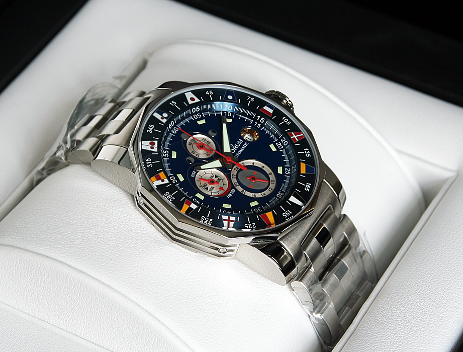 Настоящий Адмиральский Кубок с цветными флажками, очень яркие, позитивные, привлекающие внимание часы. Таких уже не выпускают. Современная линейка Corum выглядит довольно уныло и обыденно. Отлично сядут на стандартное запястье 18-19 см, но не потеряются и на более крупном. Диаметр этих часов -