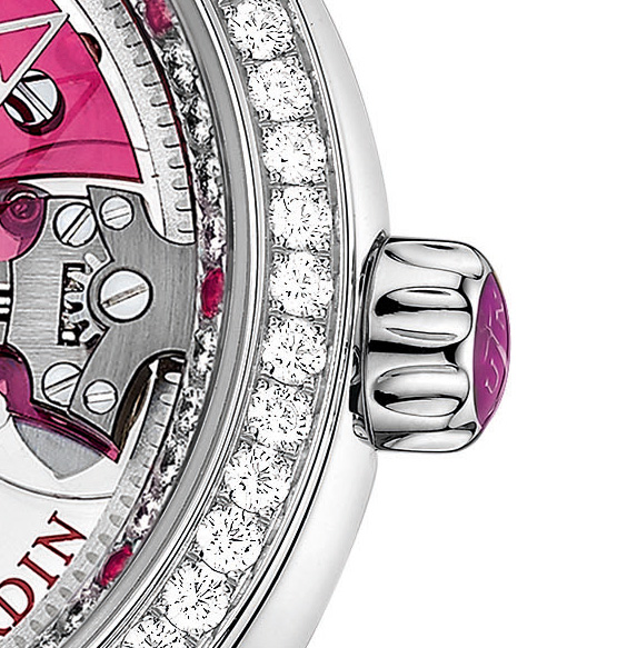 • Украшен 92 бриллиантами, безель украшен 60 бриллиантами, внутренний рант украшен 48 бриллиантами и 12 рубинами общим весом 3,27 карата