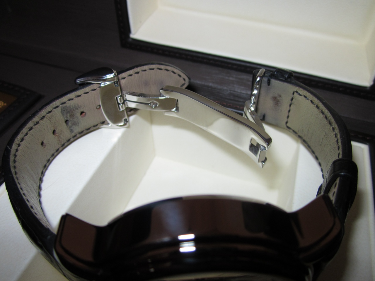 Ремень: Кожа крокодила черного цвета со стальной раскладывающейся застежкой.