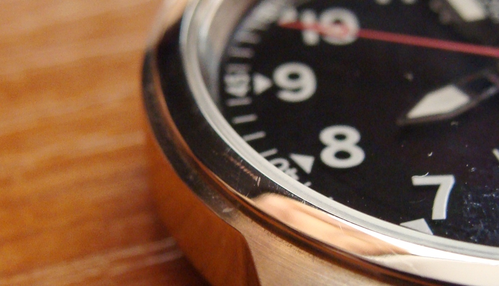 5) Корпус. Часы начали собирать мелкие царапины и уже получили пару отметин посерьёзнее. Опять-таки, ничего серьёзного, слава богу, все они пришлись на корпус, а не на кристалл. Вот покажу пока что самую заметную, предположительно, полученную при столкномении с дверным косяком.
