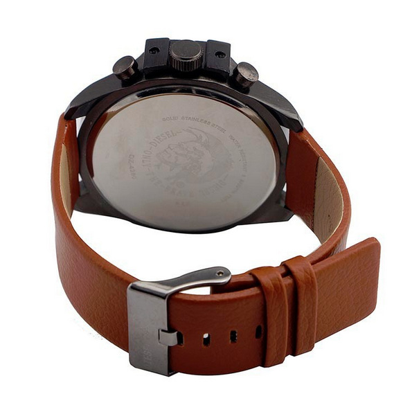 Хронограф. Индикация даты. Две временные зоны. Корпус выполнен из нержавеющей стали с IP покрытием. Стрелки с люминесцентным покрытием. Кожаный браслет. Диаметр 51 мм.