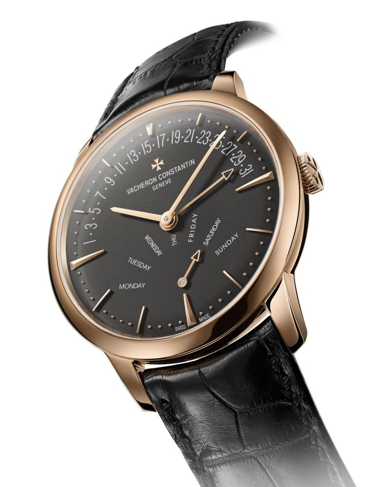 Первая из них - Patrimony Retrograde Day-Date (Ref. 86020/000R-9940). Она имеет круглый полированный корпус, изготовленный из 18-каратного розового золота, диаметром 42,5 мм, толщиной 10,0 мм, водонепроницаемый до 30 метров. На торце рифленой заводной головки, расположенной на 3 часах, выгравировано изображение мальтийского креста - эмблемы бренда Vacheron Constantin. Сапфировое стекло установлено на передней стороне часового корпуса и на его задней крышке. Циферблат выпуклый, темно-серого цвета, с накладными часовыми индексами, точечной минутной разметкой, выполненными как и стрелки, из розового золота. Модель оснащена мануфактурным швейцарским автоматическим механизмом Vacheron Constantin 2460R31R7, на 27 камнях, с балансовой частотой 28800 полуколебаний в час (4 гц), 40-часовым запасом хода, функциями индикации часов, минут (посредством соответствующих центральных стрелок), даты (посредством специальной центральной стрелки со скелетонизированным наконечником на соответствующей полукруглой шкале, расположенной на протяжении от 9 до 3 часов) и дня недели (посредством соответствующего аналогового указателя, расположенного на 6 часах). Калибр отменно отделан и декорирован. Поставляется на черном ремешке ручной работы из крокодиловой кожи с полированной тройной раскладной застежкой из 18-каратного розового золота, выполненной в форме половины мальтийского креста. Модель отмечена "женевским клеймом" ("Hallmark of Geneva").