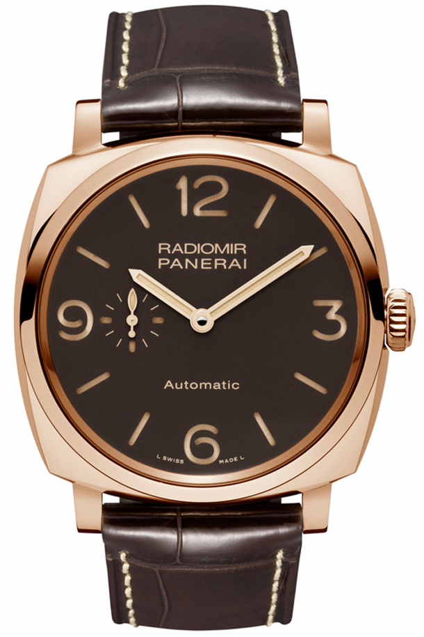 Это первые в истории часы Radiomir 1940 Automatic, оснащенные коричневым или черным ремешком из кожи аллигатора с белой строчкой.