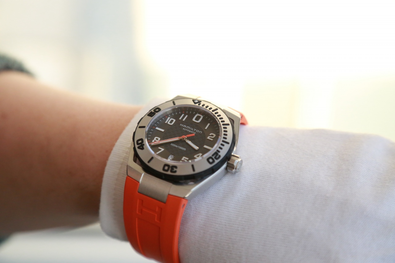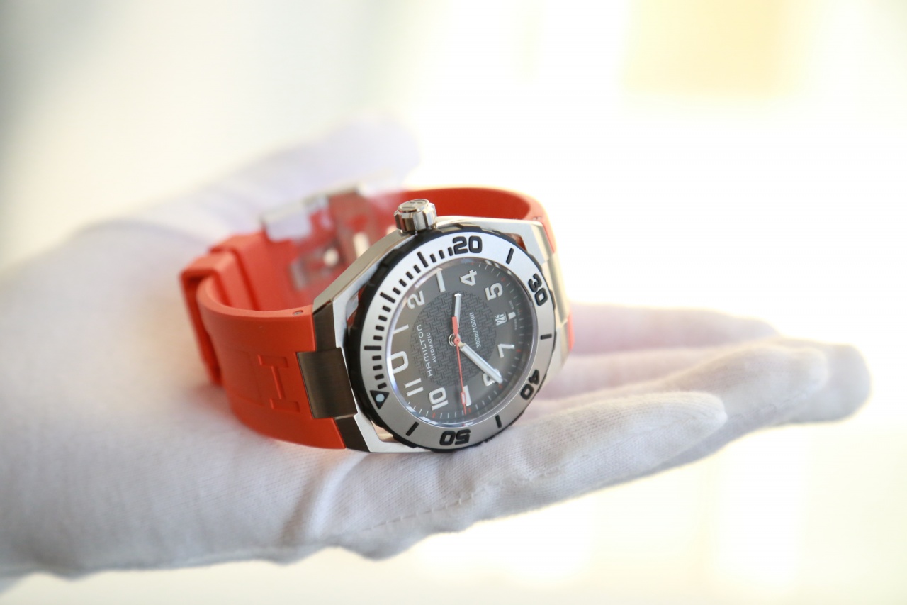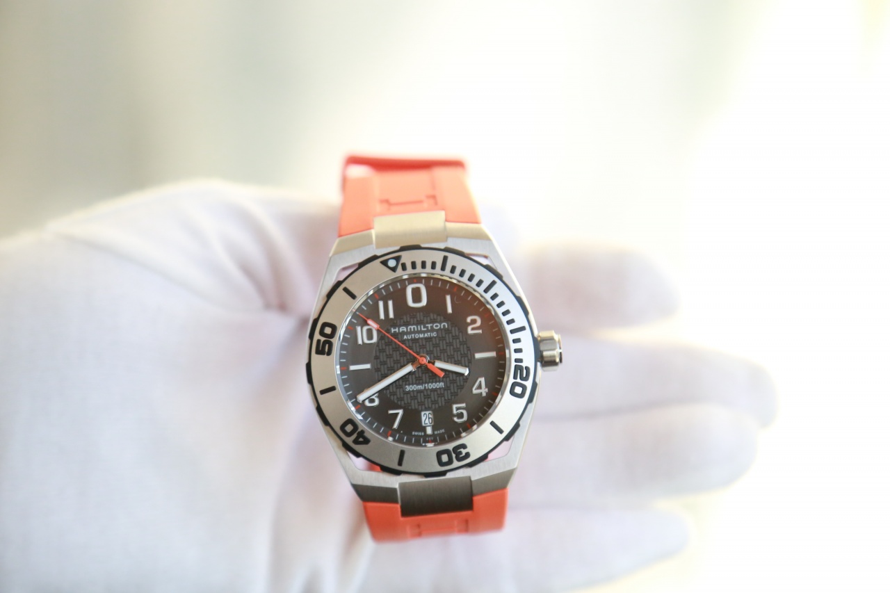 Сверхсовременные часы в морском стиле Hamilton Khaki Navy Sub Auto напоминают о появившейся в 1928 году знаковой модели Hamilton Piping Rock. Эти приметные часы сразу же становятся центром внимания. Их водонепроницаемость до 30 бар (300 м) дополняется рельефным изображением морского ската на задней крышке и элегантно-броским безелем, который прекрасно захватывается пальцами и создает завораживающий трехмерный эффект от резиновых накладок на нержавеющей стали.