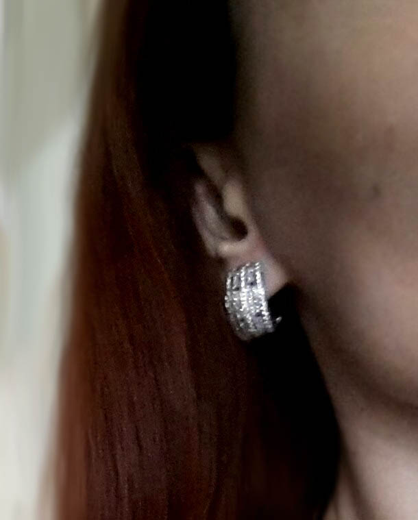 В 2 серьгах 94 круглых бриллианта (по 0,007 карата)=0,658 карата, бриллианты огранки "принцесса" 112 штук х 0,025 карат=2,8 карата, бриллианты огранки "багет" 16 шт х 0,03 карата=0,48 карата (3/3 - 4/3)