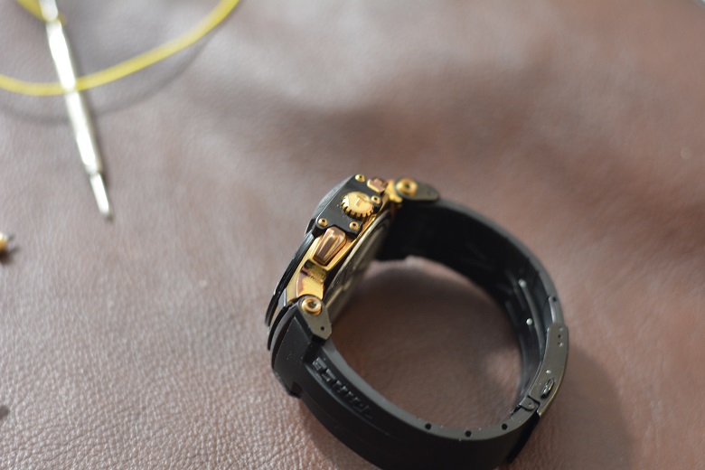 между ремешком и часами прикручены немаленькими шестигранными болтами,смотрится очень красиво, но надо признаться что когда держишь часы в руке эти фрагменты скрипят, когда часы на запястье ни каких шумов и скрипов нет. На задней крышке изображены спицы колеса, ведь T-Race это динамичный дизайн с множеством деталей из мира мотоспорта.