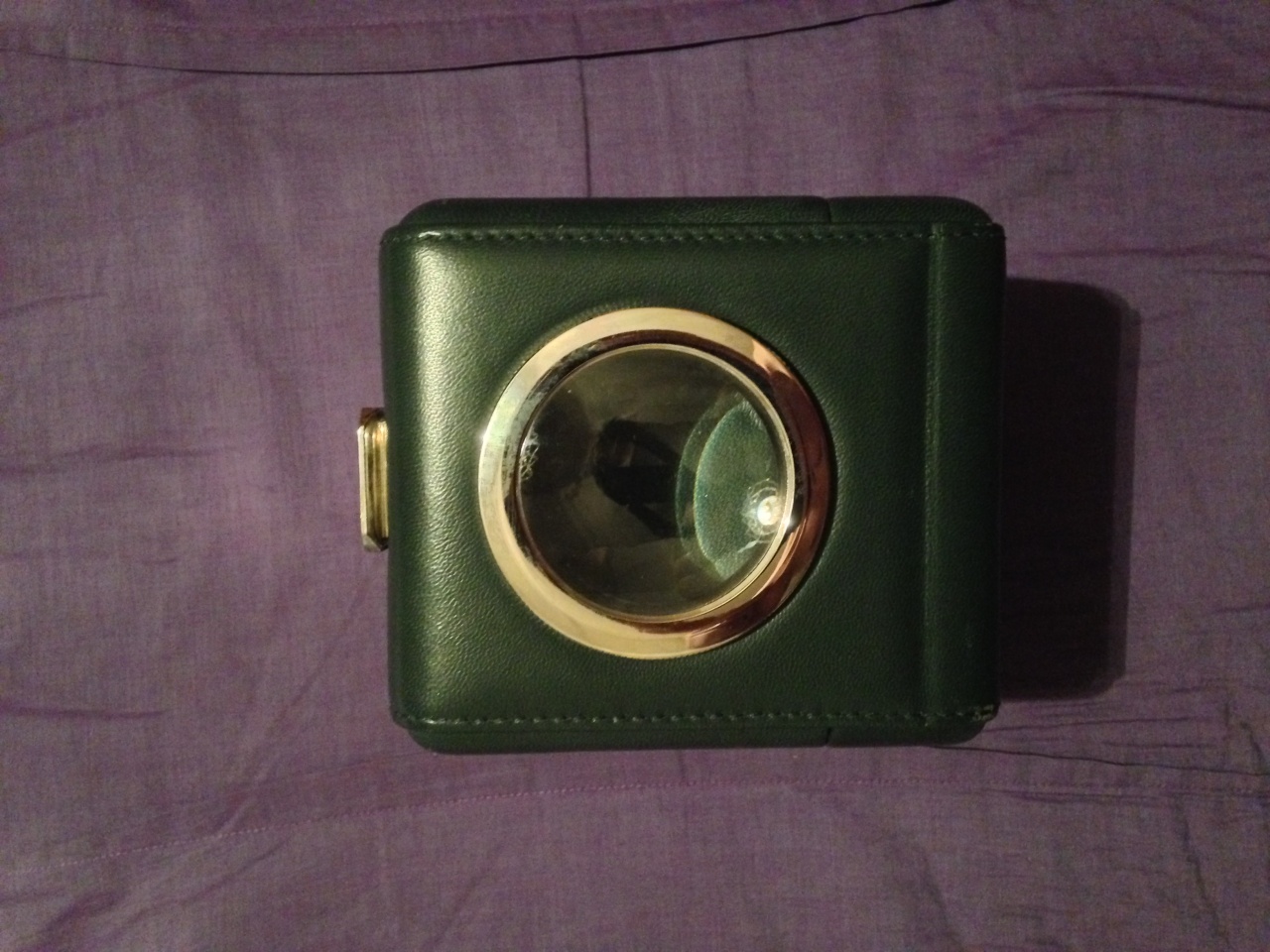 Достаточно компактная, можно брать в путешествия или хранить в малогабаритной ячейке. Полностью отделана кожей снаружи и внутри. На дверце увеличительное стекло для созерцания магического действа подзавода.