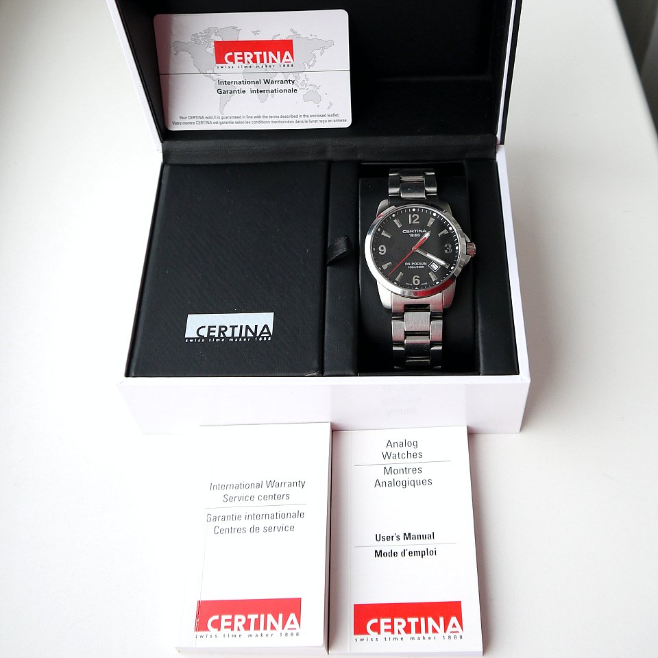 Вашему вниманию предлагаются часы Certina без особых наворотов (если не считать DS), увеличенного размера. Куплены в магазине в 2011-м, о чем имеется отметка в гарантийном талоне. Естественно, были в употреблении, но сохранили хорошее эстетическое состояние. Следы эксплуатации сводятся к небольшим потертостям и царапинам корпуса и браслета (см. фото). Стекло в идеальном состоянии - сапфир, однако. Функционально часы безупречны: идут точно, дата сменяется как положено.