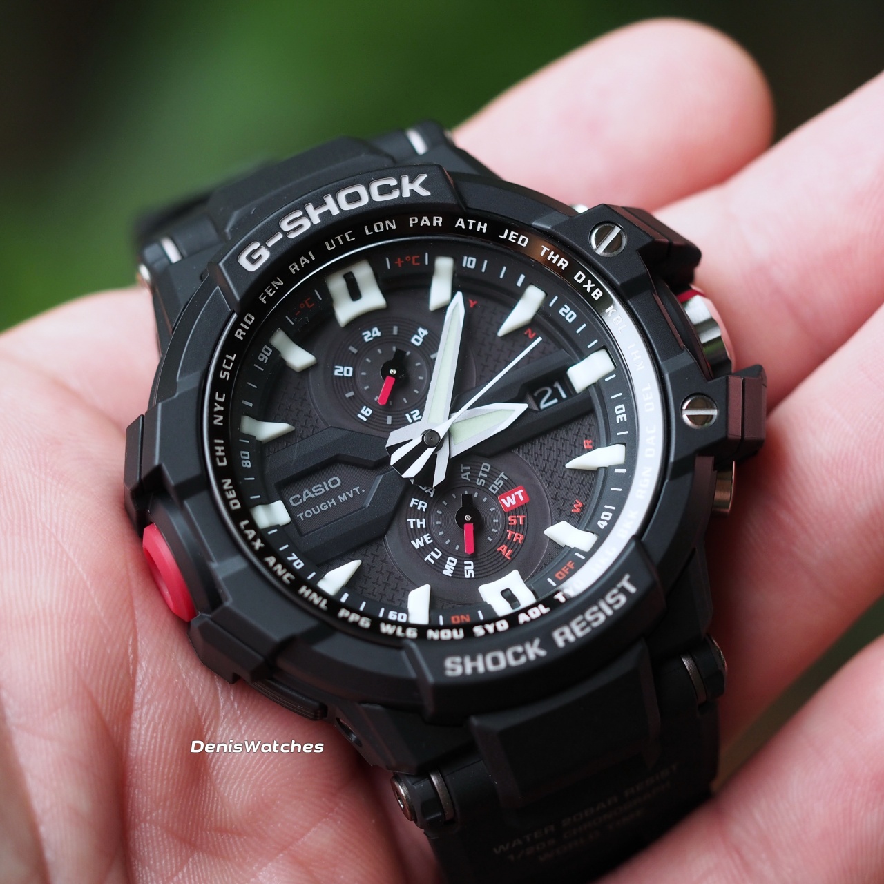 G-Shock из линейки G-Aviation - авиационный стиль, хронограф имеет дисплей «а-ля» кокпит и аналоговое отображение времени.