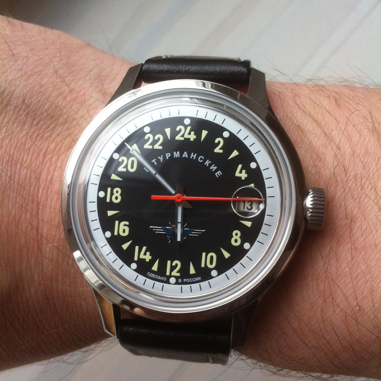 Особенностью данной модели служит 24-х часовой циферблат, то есть стрелка делает полный оборот за 24 часа, а не за 12 как обычно.
