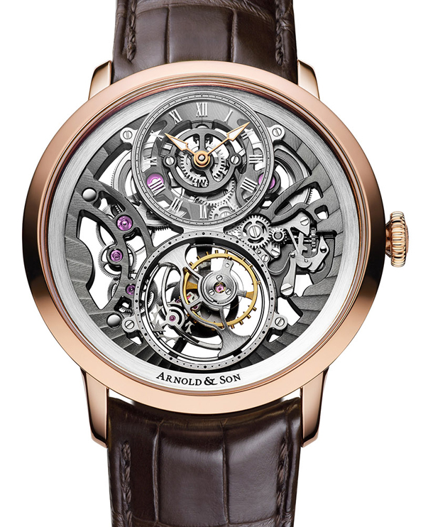 Самым тонким в мире скелетированным турбийоном является модель Arnold and Son UTTE Skeleton. Толщина скелетона составляет 8.34 мм в самом широком месте корпуса. Механизм, встроенный внутри корпуса, имеет толщину 3.3 мм. Комбинация скелетированных мостов и ультра тонкого профиля – задание не из легких, особенно когда речь идет о жесткости очень тонких мостов и колес. Однако, у мануфактуры Arnold and Son получилось этого достичь.