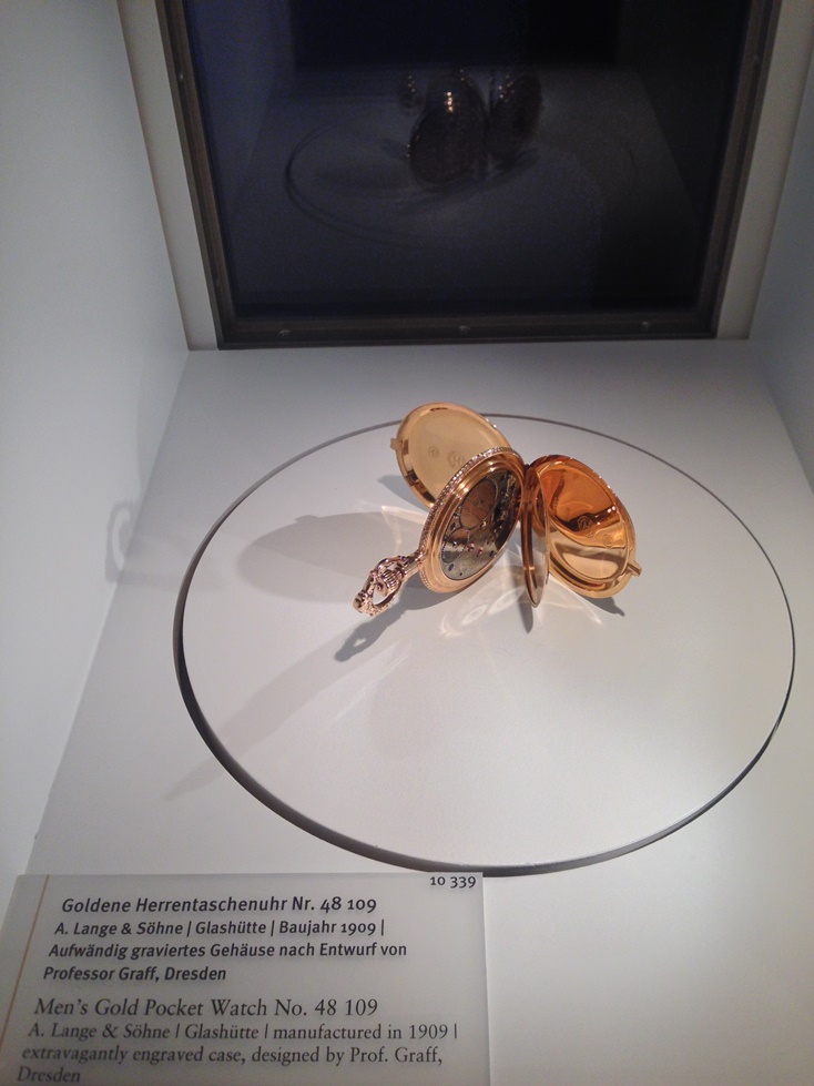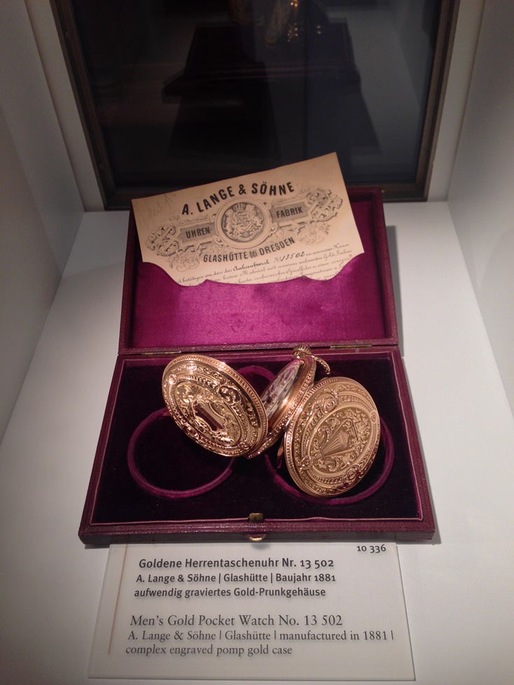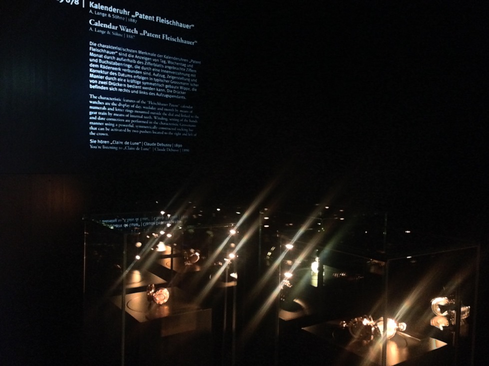 Для людей, хоть немного разбирающихся в часах, в этом зале нет ничего нового, но детям он очень нравится. Я же обратил внимание совсем на другие вещи: большинство экспонатов в окошках – это детали современных ГО с соответствующим логотипом. АЛС здесь тоже представлены, но на примере старых карманных часов или платины с ручной гравировкой названия производителя, которую и разобрать-то сложно. Таким образом достигается максимальная ассоциация немецкого часового мастерства с маркой ГО за счет логотипа. Маркетинг в чистом виде, но глаз не режет