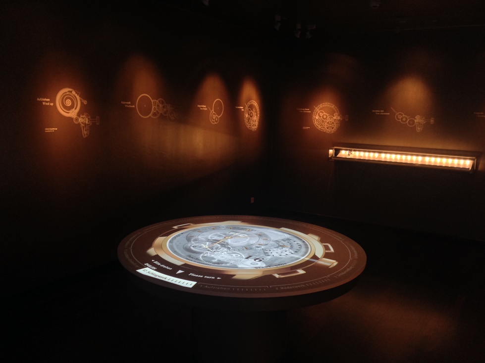В центре комнаты есть стол, на который сверху проецируется изображение. Фишка в том, что сам стол круглой формы и его можно вращать как в Поле Чудес: выбираем нужную функцию часов и смотрим, какие детали и механизмы задействованы при ее исполнении. Описать весь процесс сложно, но на самом деле это очень увлекательно. Вывод один: оказавшись в Гласхюттинском музее, не бойтесь двигать, крутить и нажимать))) С другой стороны, целесообразность «зала одной модели» для меня не совсем понятна, ведь как минимум его нужно часто обновлять вслед за флагманами ГО..