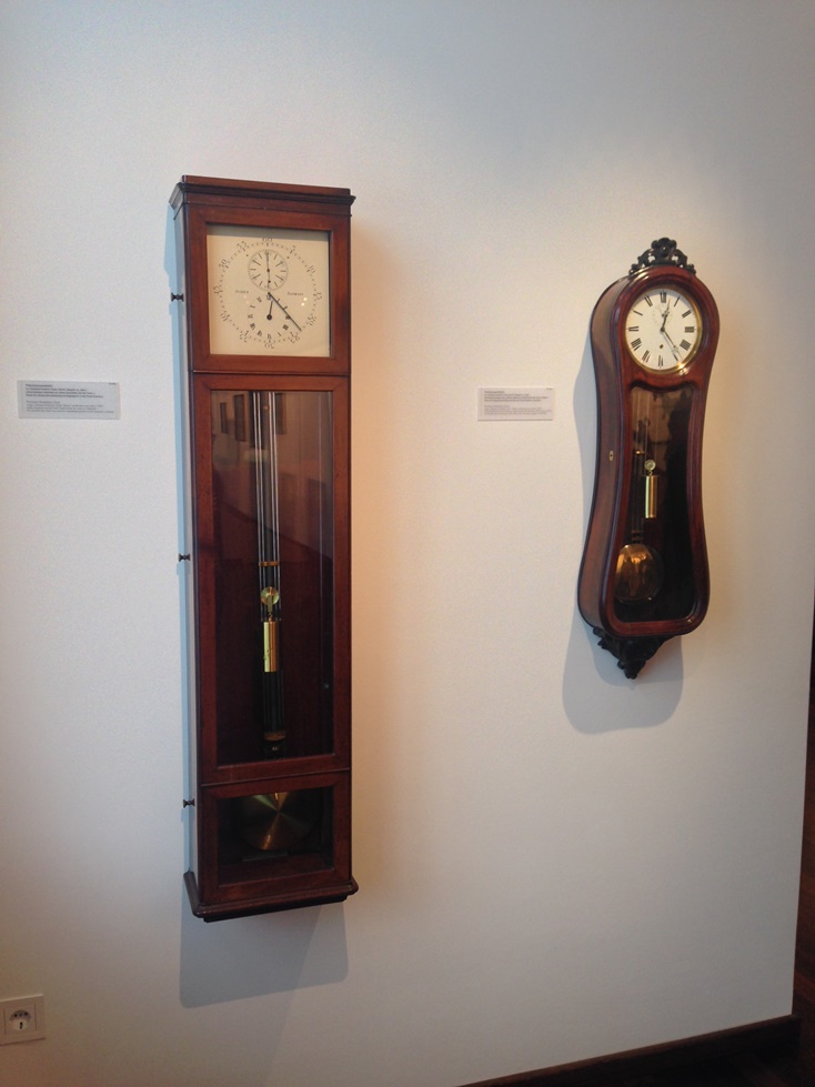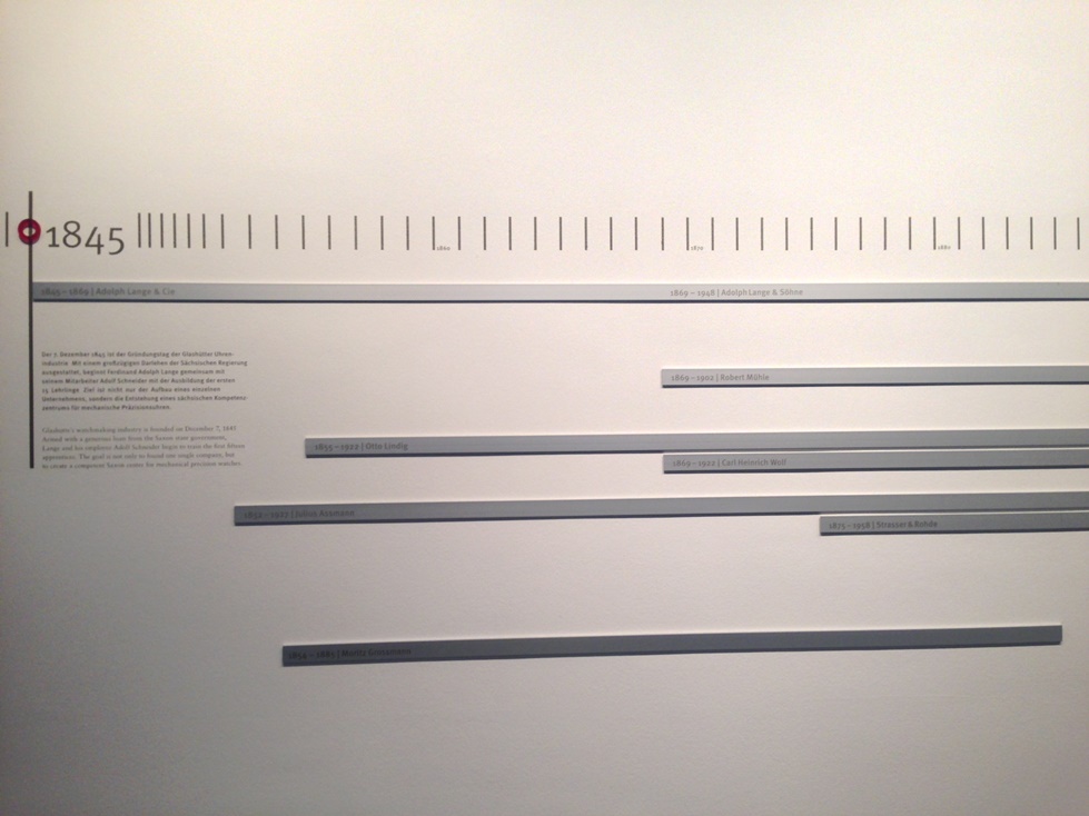 Честно говоря, увидев это чудо, я грешным делом подумал «Приплыли! Сейчас начнется… Первыми часами после смерти динозавров…». Но мои опасения были напрасны: перешагнув порог следующего зала, мне стала понятна концепция музея. Обратите внимание на стену. Она имеет вид таймлайна, а все залы (за исключением дополнительных) расположены в хронологическом порядке. Путешествие во времени начинается с «Зала основателей», который посвящен отцам-мастерам немецкого часового искусства (Ferdinand A. Lange, Julius Assmann, Adolf Schneider, Moritz Grossmann).