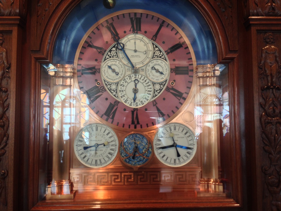 На входе нас встречают огромные астрономические часы авторства Hermann Goertz, которые состоят из 1756 компонентов. На табличке слева есть краткая информация об их творце, а справа – перечень основных функций (вечный календарь, различные астрономические указатели и суб-циферблаты).