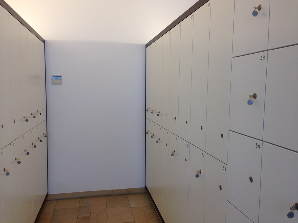Чуть поодаль находится гардероб. Система здесь стандартная: для предотвращения кражи ключей на сувениры (обратите внимание на гравировку жетона – Deutsches Uhrenmuseum Glashuette) перед закрытием дверцы нужно внести депозит 1 евро одной монетой, которую потом забираем вместе с вещами. У меня не было при себе мелких наличных, поэтому воспользоваться им не удалось, а рюкзак пришлось носить с собой