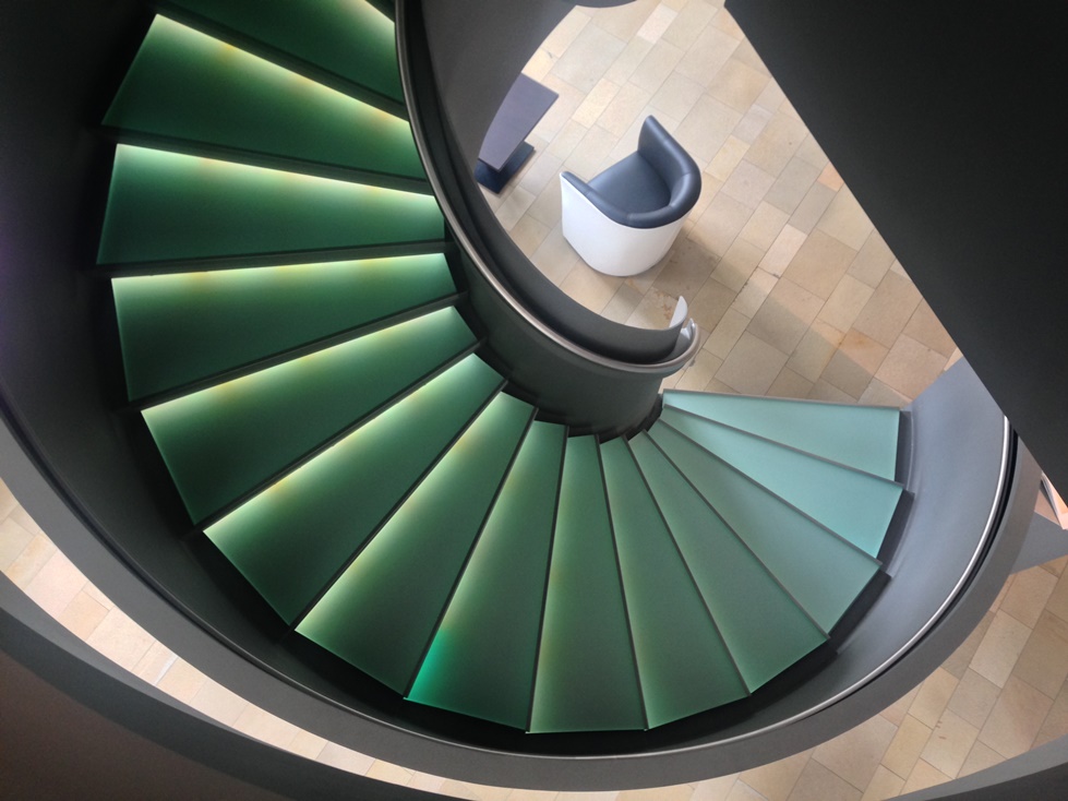 Винтовая лестница имеет приятную зеленую подсветку, а общее количество ступенек равно 24 по количеству часов в сутках.