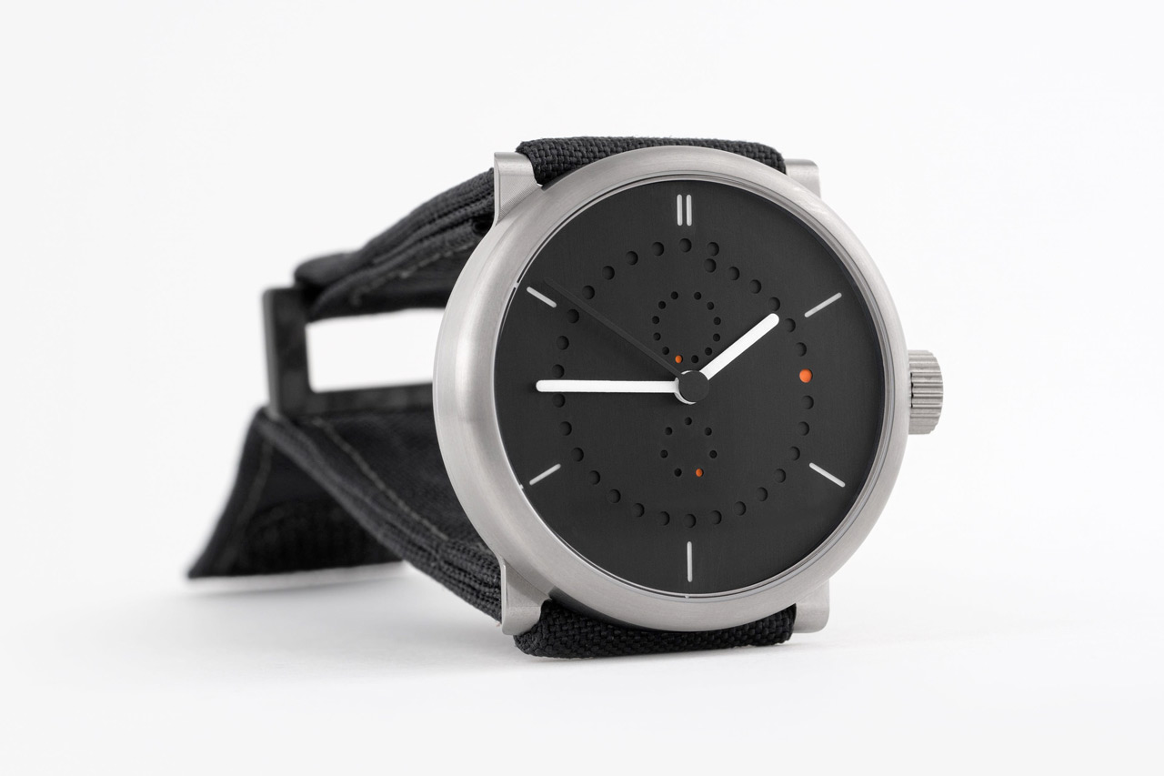 Новинка имеет круглый корпус, диаметром 42,0 или 39,0 мм, водонепроницаемый до 50 метров. Рифленая заводная головка расположена на 3 часах. Матово-черный циферблат защищает сапфировое стекло с антибликовым покрытием. Часовая и минутная стрелки белого цвета, а секундная - черного. Модель оснащена швейцарским автоматическим механизмом ETA 2824-2, модифицированным Людвигом Охслином, с балансовой частотой 28800 полуколебаний в час (4 гц), 38-часовым запасом хода, функциями индикации часов, минут, секунд (посредством соответствующих центральных стрелок), даты (посредством оранжевой точки, "передвигающейся" по часовой стрелке на перфорированном центральном "циферблате", состоящем из 31 микроапертуры), дня недели (посредством оранжевой точки, "передвигающейся" против часовой стрелки на перфорированном малом боковом "циферблате", расположенном на 6 часах, и состоящем из семи микроапертур), месяца (посредством оранжевой точки, "передвигающейся" против часовой стрелки на перфорированном малом боковом "циферблате", расположенном на 12 часах, и состоящем из двенадцати микроапертур).