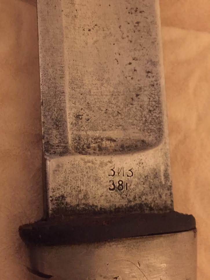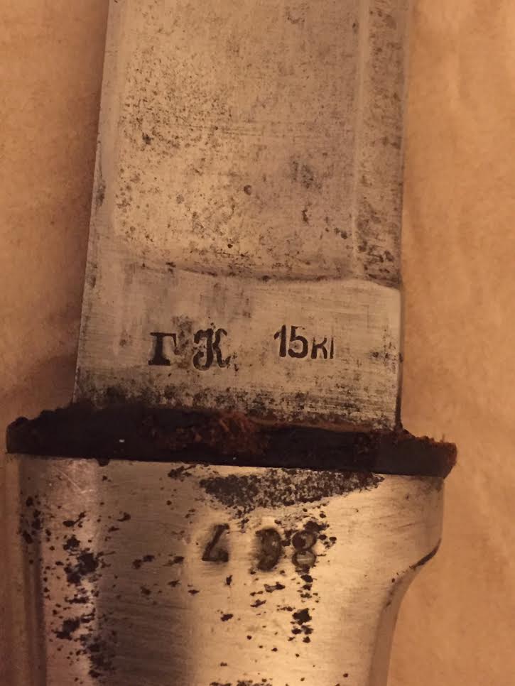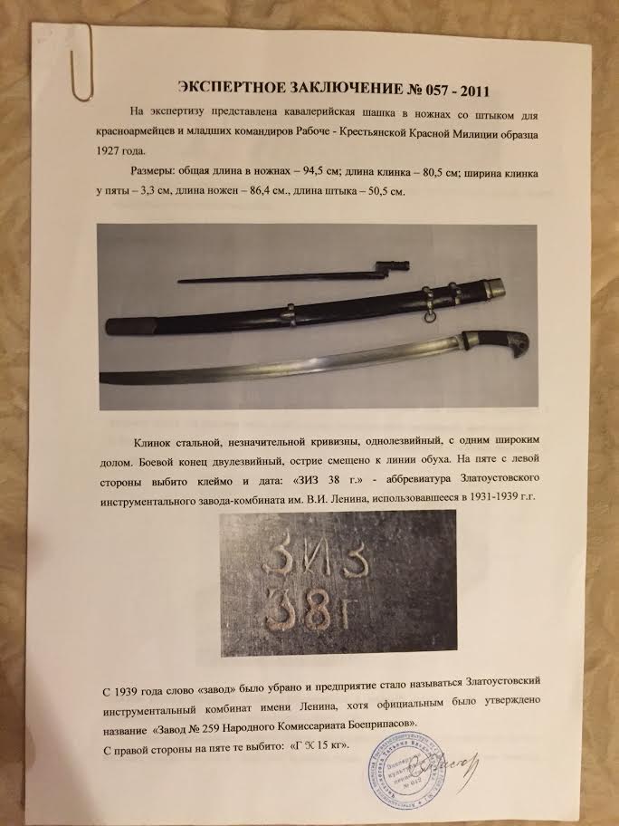Клинок незначительной кривизны, с одним широким долом, у основания клеймо Златоустовского инструментального завода (ЗИЗ) с 1938 годом выпуска.