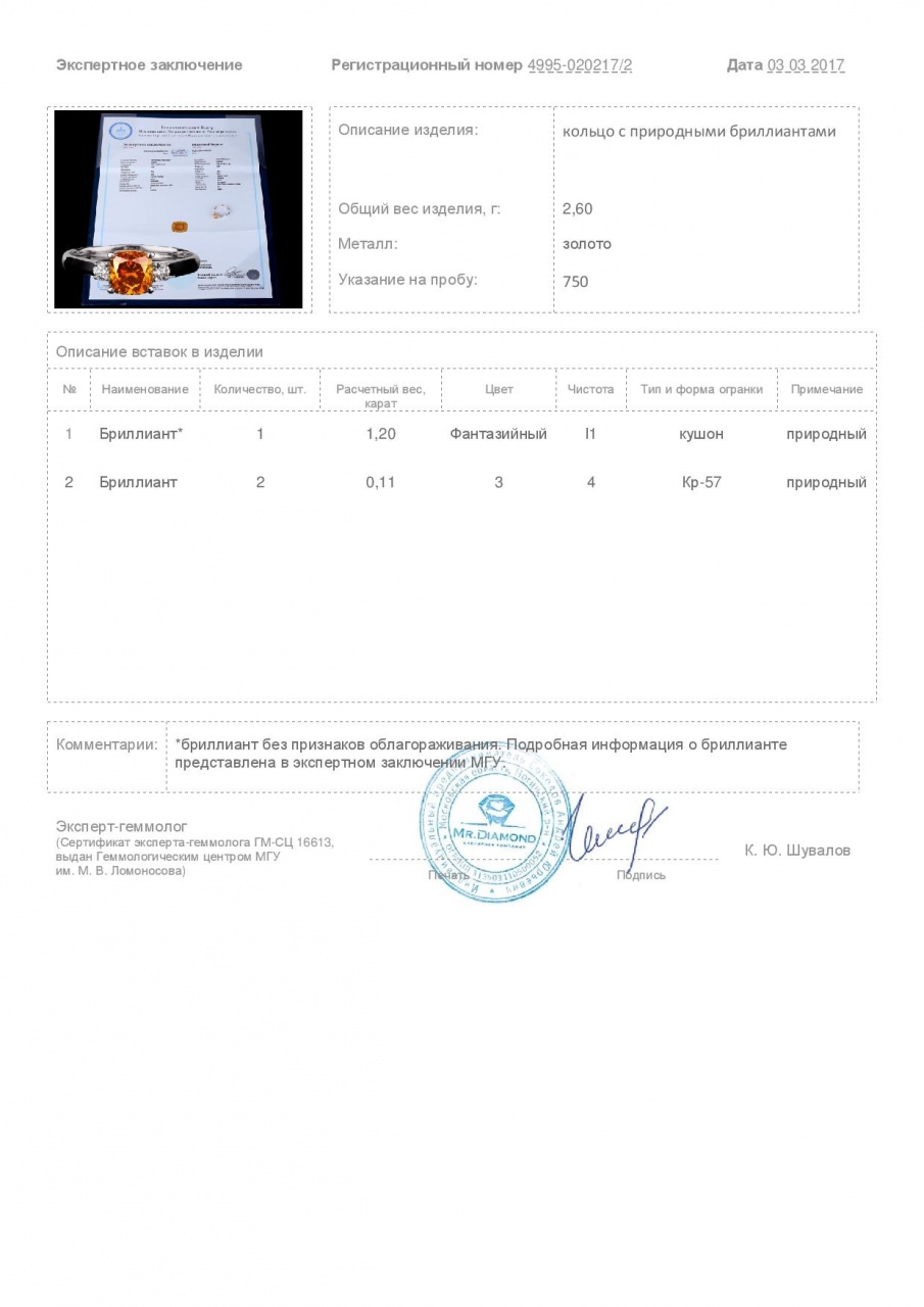 1 Бриллиант огранки "кушон" 1.20ct Fancy Yellow Brownish/I1