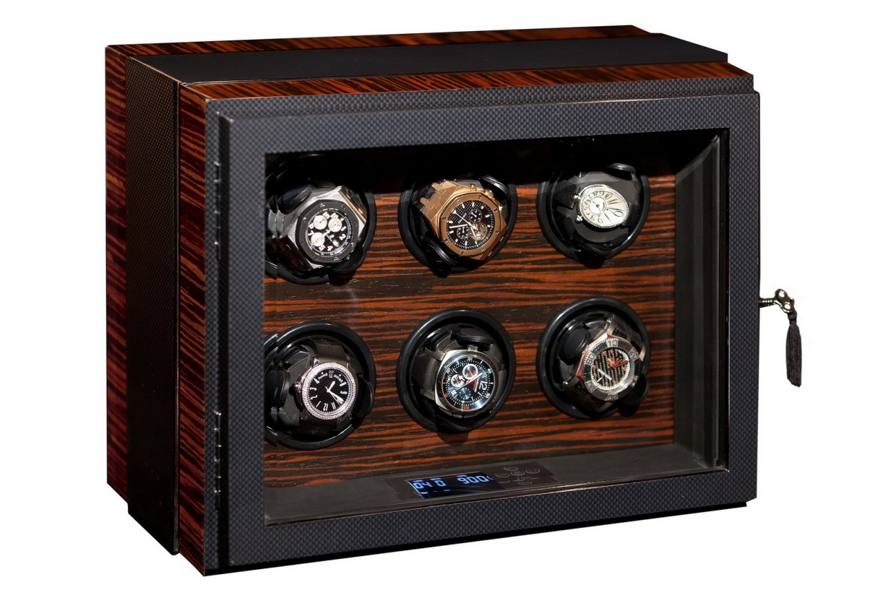 Красивая, практичная шкатулка коричневого цвета от компании ALTITUDE предназначена для хранения и автоматической заводки 6-и часов. Модель INNOVATION6. Экстерьер коробки для завода часов выполнен из макассара, покрытого лаком, рамка и вставка из карбона покрыты 15-ю слоями рояльного лака. Бесшумный высоконадежный мотор потребляет минимальное количество электроэнергии.