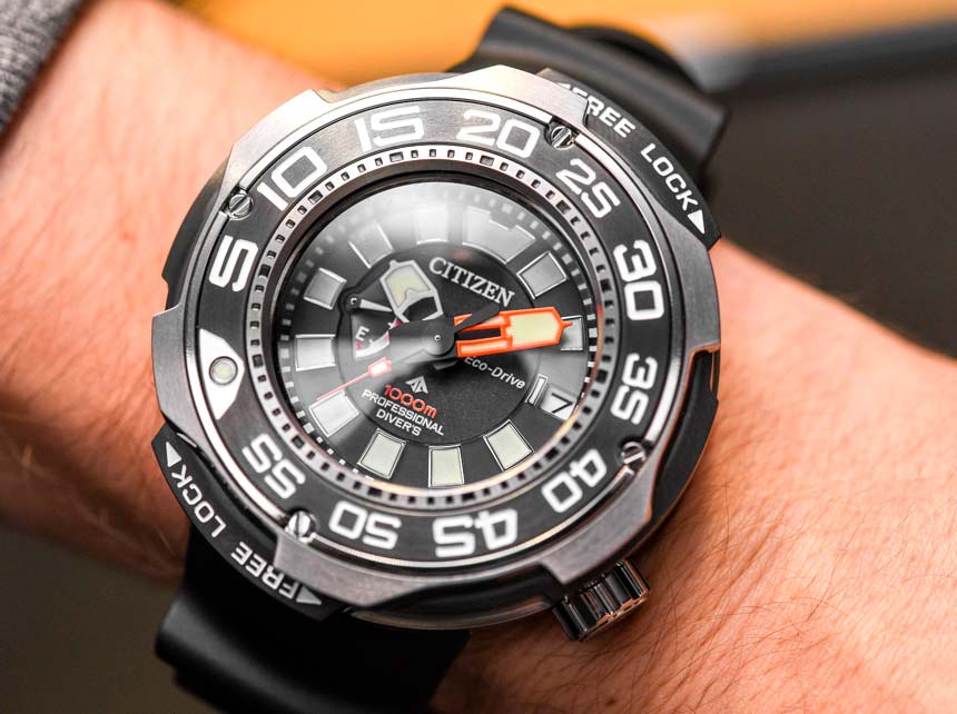 В Citizen Eco-Drive Promaster Professional Diver 1000m есть автоматический клапан для выпуска гелия. Профессиональные водолазы, которым нужны такие вещи, как точный отсчет времени в декомпрессионной камере, конечно же, оценят эти функции, но большинство потенциальных покупателей данной новинки, вероятно, никогда не узнают, на какие подвиги способны их Citizen Eco-Drive Promaster Professional Diver 1000m.