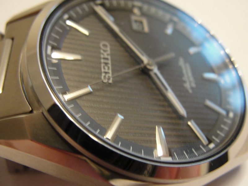 Классика из линейки Presage. Для внутреннего рынка Японии. Тёмно-серый циферблат с продольными полосами, накладной логотип SEIKO, накладное окно даты и метки.