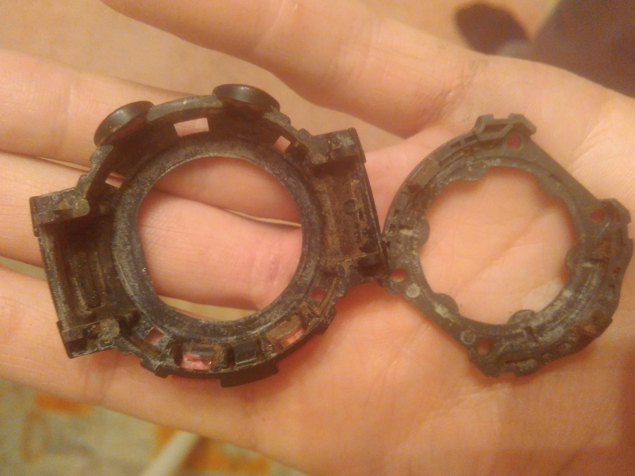 О, фоточки оказывается сделал, из головы вылетело. тут наглядно видно что там за годы эксплуатации скопилось. И ухо отломанное. Отвалившийся кусочек залил акриловым клеем и присобачил на место, приклеилось и к кожуху, ну пусть так, может хоть держаться будет, правда кожух теперь не снимается).... а держится, по видимому, на соплях. В сервисном центре Касио сказали только корпус менять и запросили 5(!!!) тысяч за новый корпус. плюс работа. Дичь. Думал может эпоксидкой какой залить сломанное ухо или пластмассы наплавить, но пока ни до чего такого не дошли руки. А по поводу грязи под корпусом...Не понимаю, к чему такая глупая конструкция, это ж по логике, кожух каждый раз после водных процедур или тур походов снимать надо и чистить, т.к. влага внутрь проникает, а после того как высыхает, грязь в ней содержавшаяся остается и копится, и не думаю что это безвредно....да и вода внутри, если например морская - она ж не сразу высыхает, и корпус модуля так или иначе мал по малу разъедает, да и металлические части тоже. Может смазкой силиконовой все там промазать...Буду рад совету в этом нелегком деле, и если кто подскажет как это ухо сломанное восстановить!!!