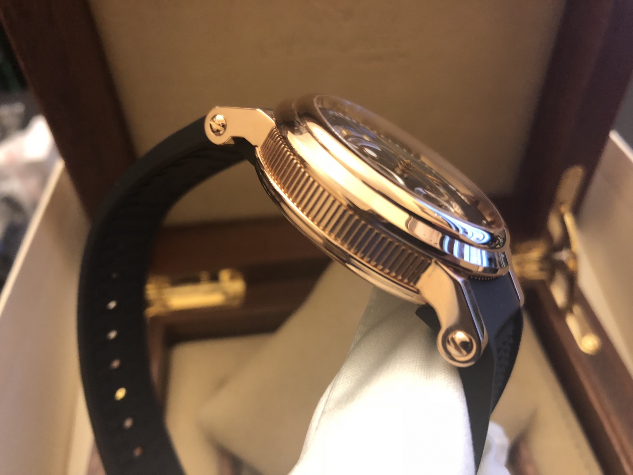 Хронограф линии Marine из 18-каратного розового золота. Автоматический механизм с указателем даты и малой секундной стрелкой. 15-минутный сектор. Суммирующий счетчик часов и минут в центре. Циферблат из золота с черным родиевым покрытием и гильошированным вручную узором. Задняя крышка из сапфирового стекла. Навинчивающаяся заводная головка. Водонепроницаемость до 100 м. Диаметр: 42 мм.