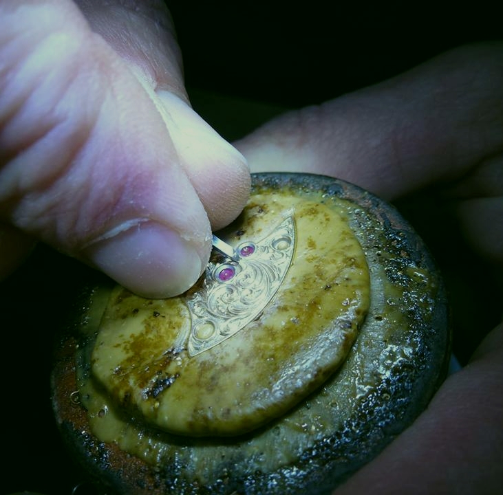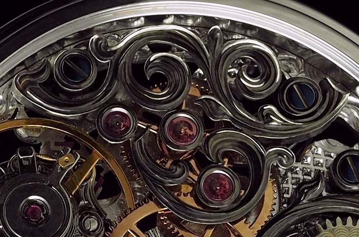Исходя из первоначальной формы базисной платины и крепёжных мостов, формируется дизайн будущей гравировки в сочетании с конструкторским решением, дабы последующим выпиливанием не нарушить статику будущих часов. Затем карандашный дизайн гравировки переносится на детали механизма при помощи алмазной иглы. Механизм гравируется штихелем вручную при помощи микроскопа, после чего необходимо выпилить оставшиеся, незаполненные гравировкой поверхности. Для этого деталь засверливается микросверлом и нужная поверхность выпиливается тончайшим лобзиком. Готовая деталь покрывается микроскопическим слоем золота, защищающим её от коррозии и придающим магическую притягательность благородного металла.
