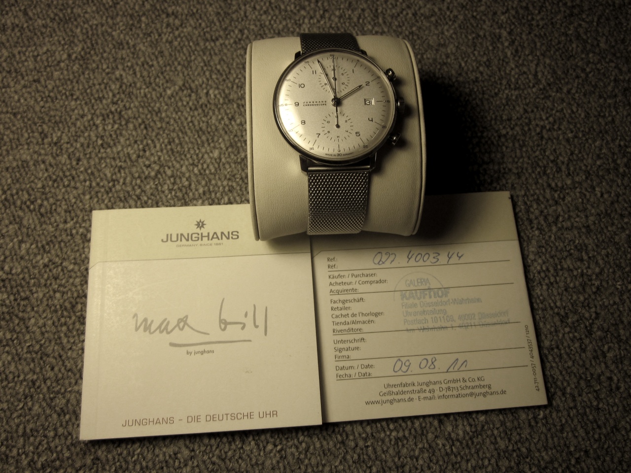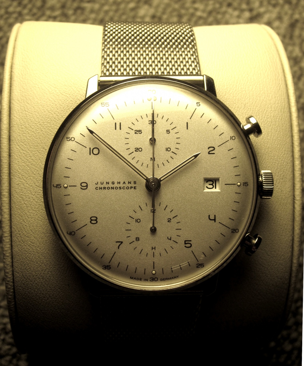 Автоматический хронограф, историческая модель в стиле Bauhaus, дизайн разработан для Junghans в 60-х годах известным художником Max Bill, чей автограф выгравирован на задней крышке.