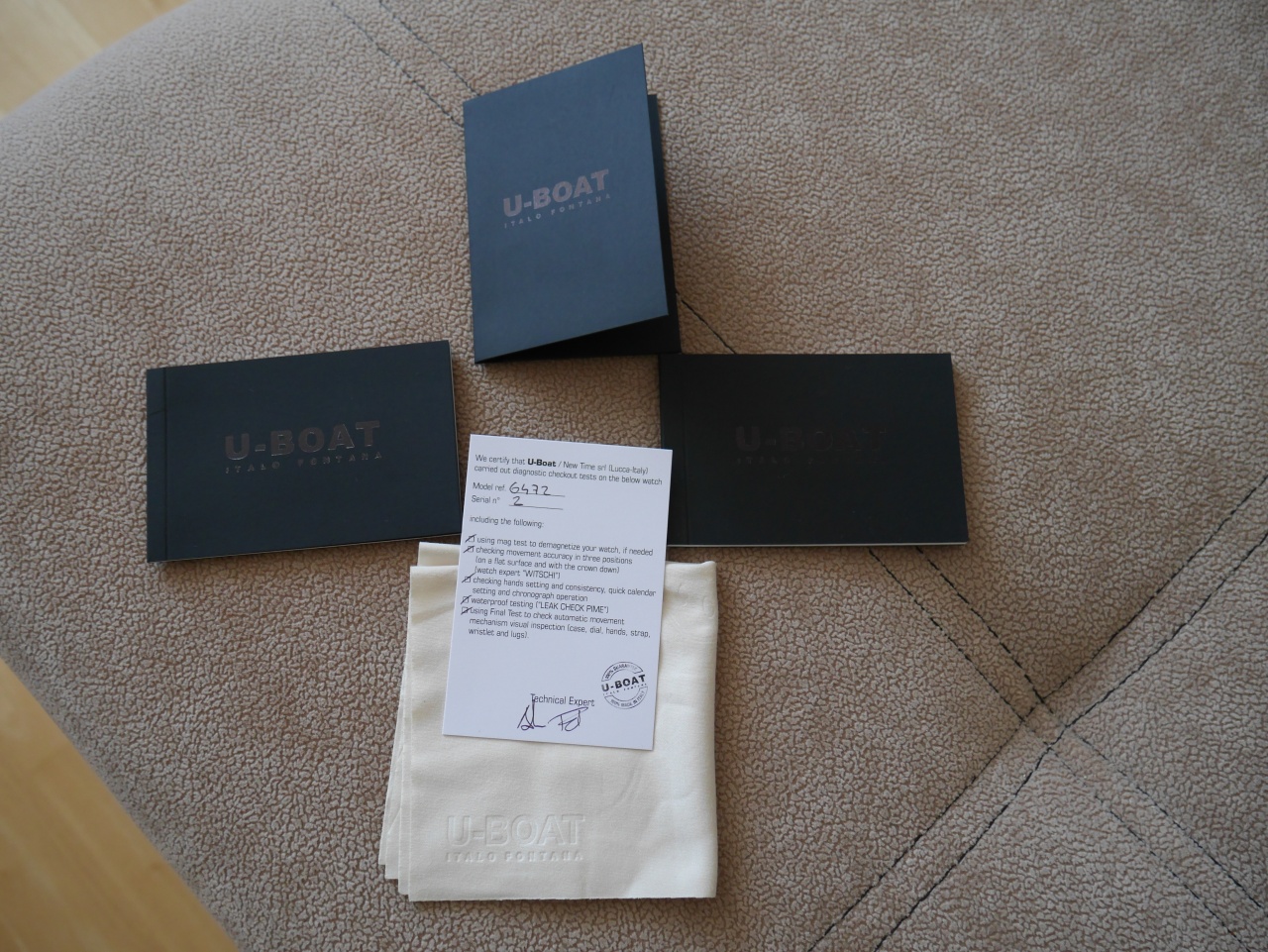 Часы на полном комплекте, включающем: фирменный пакет, коробку, эпичный стилизованный именно под эту модель алюминиевый кейс с окном-скафандром, отвертка для смены ремешка, фирменная тканевая салфетка, бирка, сертификат с персональным номером часов и отметках о прохождении тестов и приемок, паспорт (в котором приведена подробная технология изготовления именно этих часов, приведена схема расположения всех деталей и инструкция по использованию), гарантийная книжка. В комплекте также открытка с живым автографом самого Italo Fontana!