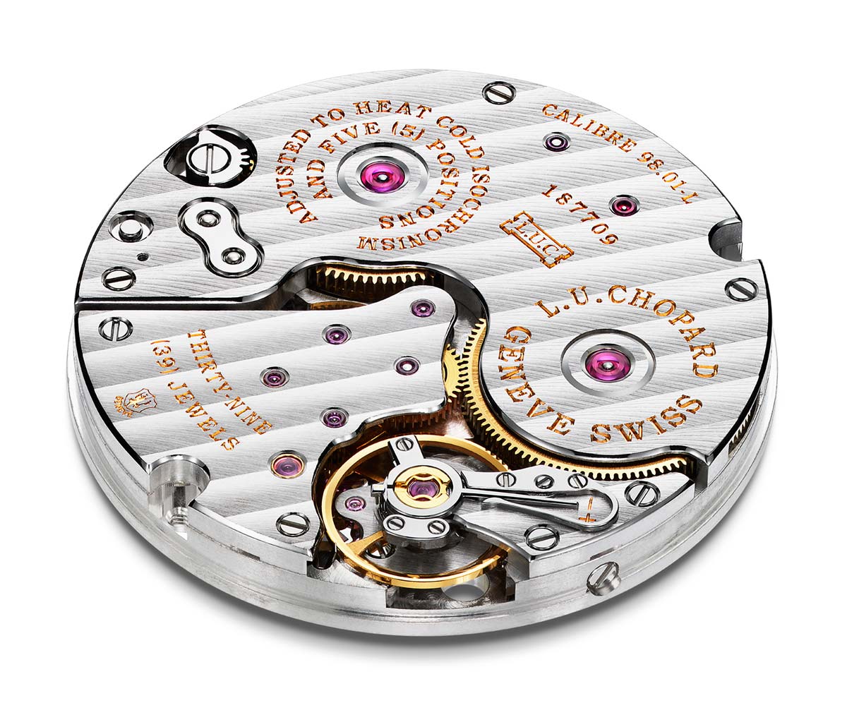 Круглый полированный корпус новинки, изготовленный из 18-каратного розового золота, диаметром 43,0 мм, водонепроницаемый до 50 метров. На торце рифленой заводной головки, расположенной на 3 часах, выгравирован логотип L.U.C. Сапфировое стекло с антибликовым покрытием установлено на передней стороне часового корпуса и на его завинчивающейся задней крышке. Циферблат серебристого цвета, отделанный вертикальным сатинированием, с накладными синими римскими цифрами, а также с синими часовой и минутной стрелками, покрытыми люминесцентным составом SuperLumiNova белого цвета. Модель оснащена мануфактурным швейцарским механизмом с ручным заводом L.U.C. 98.01-L, с четырьмя последовательно связанными заводными барабанами, с балансовой частотой 28800 полуколебаний в час (4 гц), запасом хода 216 часов (9 дней), функциями индикации часов, минут (посредством соответствующих центральных стрелок), секунд (на соответствующем малом боковом циферблате, расположенном на 6 часах), даты (посредством соответствующего круглого аналогового указателя, совмещенного с малым боковым циферблатом, расположенным на 6 часах) и запаса хода (посредством соответствующего аналогового указателя, расположенного на 12 часах). Калибр отлично отделан и декорирован (в частности мосты - "женевскими волнами" - Côtes de Genève), отмечен Женевским клеймом (Poinçon de Genève Hallmark), официально сертифицирован COSC в качестве хронометра.