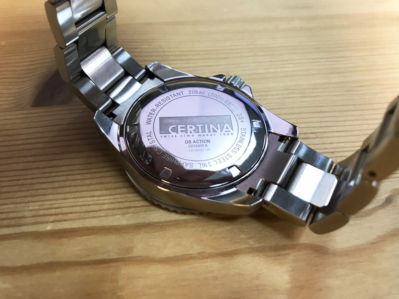 Часы в отличном состоянии. Недавно заменил батарейку в официальном сервисном центре. В комплекте: фирменная коробка Certina со всеми книжечками, дополнительные звенья для браслета, тканевый браслет Nato (расцветка а-ля Джеймс Бонд), чек на замену батарейки.