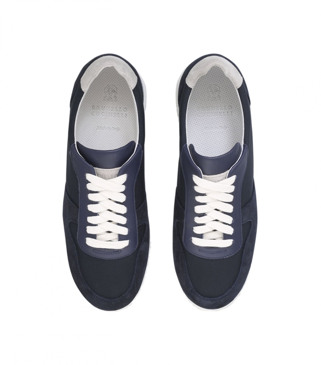 В продаже,новые мужские сникеры известной итальянской марки BRUNELLO CUCINELLI.Кроссовки изготовлены из натуральной замши тёмно-синего цвета с бархатистой текстурой,полуглянцевой телячьей кожи и текстурированного вафельного нейлона в виде сот.Вставки на пятке и язычке серо-бежевого тона перекликаются с оттенком клиновидной полосы на платформе.Внутри изделие отделано перфорированной натуральной кожей,что обеспечивает комфорт.Обувь очень удобная и лёгкая благодаря материалам союзки и подошве из Micro.Белоснежные шнурки завершают образ.