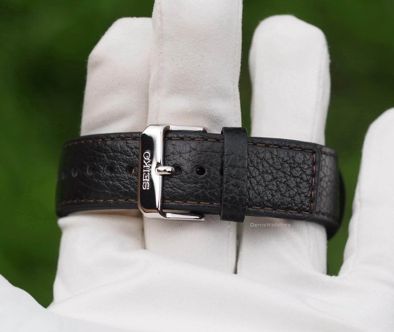 Темно-бордовый циферблат, накладные метки, окантовка даты и логотип SEIKO
