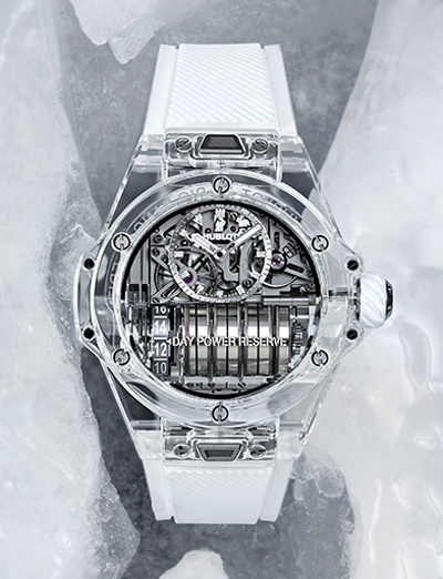 Вторая версия данной модели выпущена в корпусе из сапфира. Лидер крупномасштабной обработки искусственного сапфира, самого твердого и стойкого материала после алмаза, Hublot переводит кристаллический корпус на новые высоты, награждая его кривыми изгибами, которые следуют по контуру цилиндров механизма. Столь же великолепный, как двигатель, он содержит в себе выпуклость, чтобы создать эффект увеличительной лупы над индикатором запаса хода.