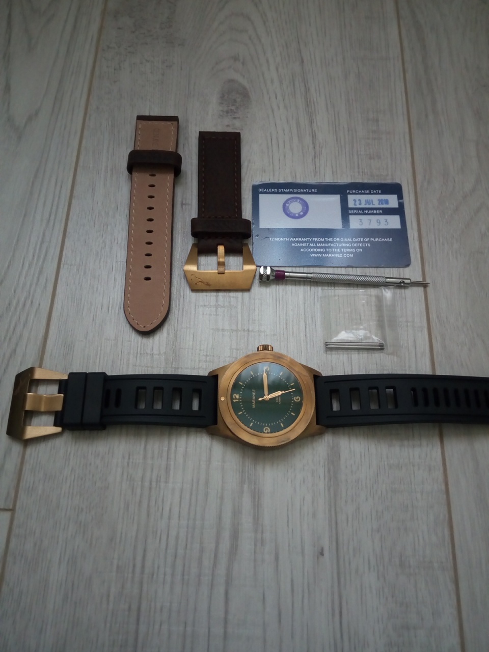В продаже латунный дайвер в стиле "боевых плавцов" Maranez Talay с зеленым лицом. Часы можно сказать что новые, июль 2018г. Задумчиво примерялись на руку раз пять