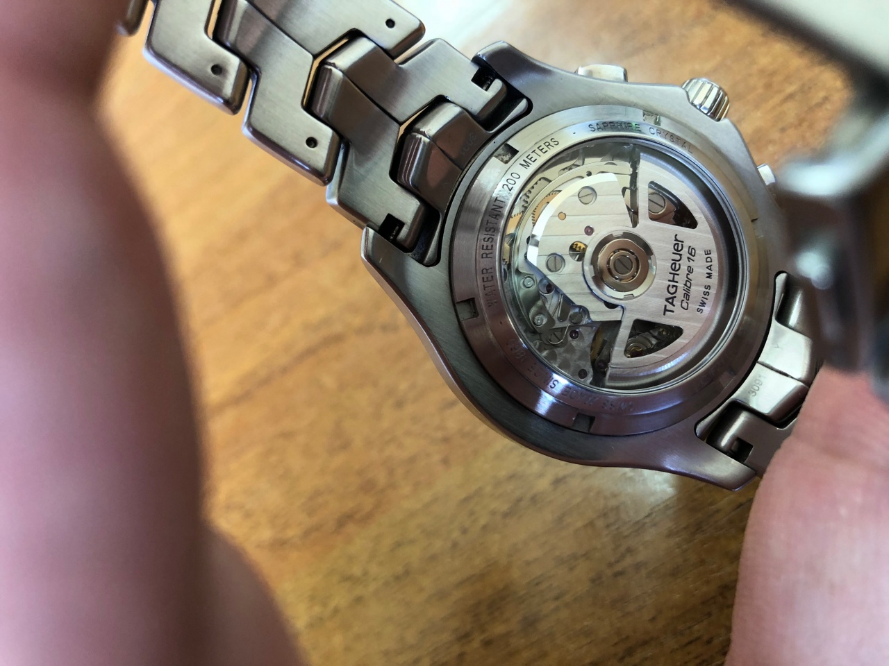 Одноцветный логотип TAG Heuer. Надпись "LINK – AUTOMATIC – 200m". Завинчивающаяся коронка .Задняя крышка: сапфировое стекло, позволяющее любоваться механизмом и его колесиками. Ажурный вращающийся ротор, узор Cotes de Geneve.