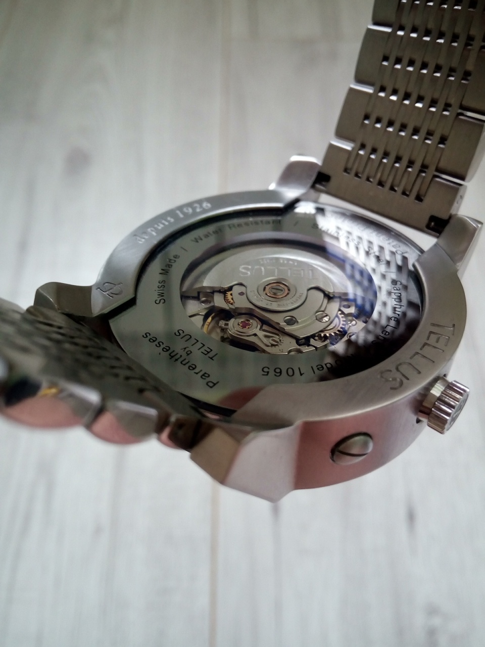 TELLUS Discoverer. Состояние отличное (состояние "B" в описании обусловлено правилами из-за смены браслета, по факту состояние ближе к "АА", часы носились редко и бережно), стекла чистые, по корпусу если только микроволоски. На фоне массы однотипных часов вы не останитесь незамеченным, проверено!