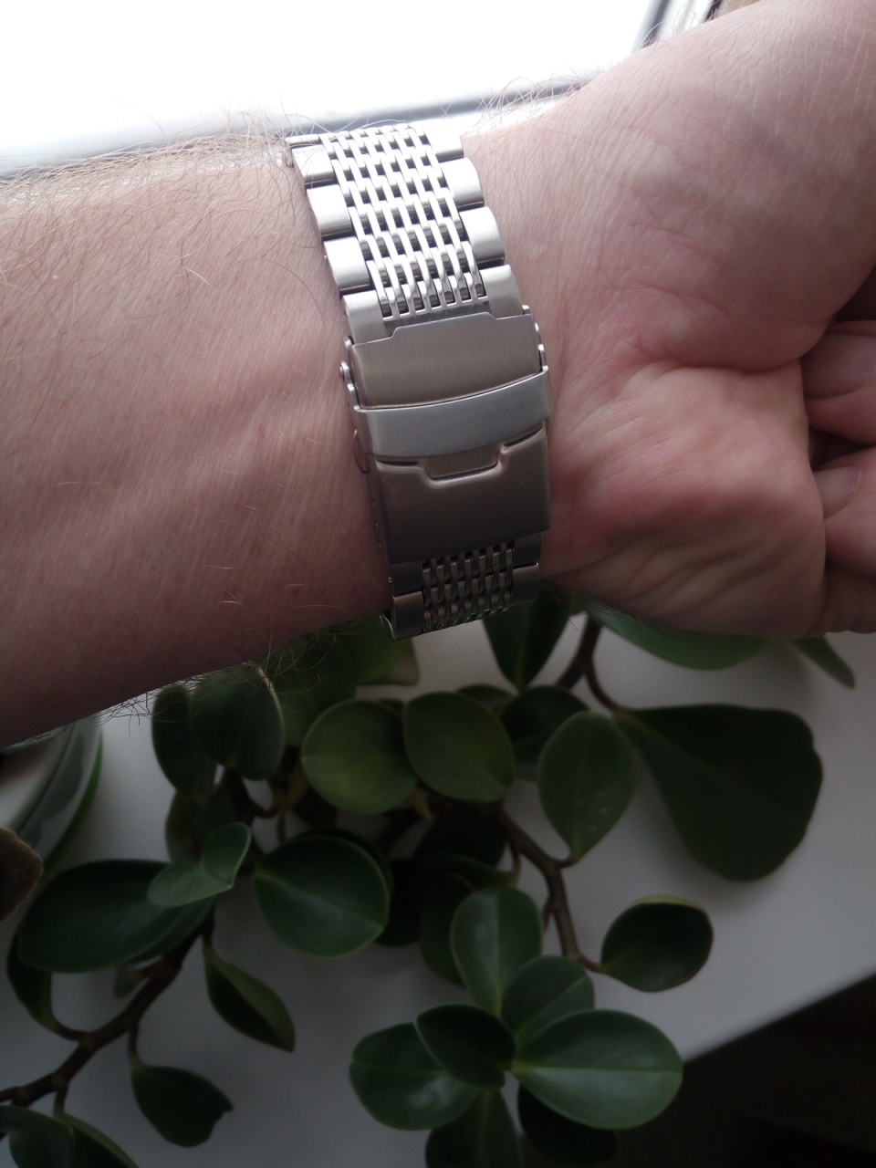Браслет: на 22мм, не родной, т.к. родной не лучшего качества был, этот намного круче и лучше подходит к часам, на руку примерно 18,5 см, есть три снятых звена. Также в комплекте купленный к этим часам ремень из кожи питона (на фото) с застежкой бабочкой, новый, опять же крайне подходит к данному циферблату, если хочется повеселее