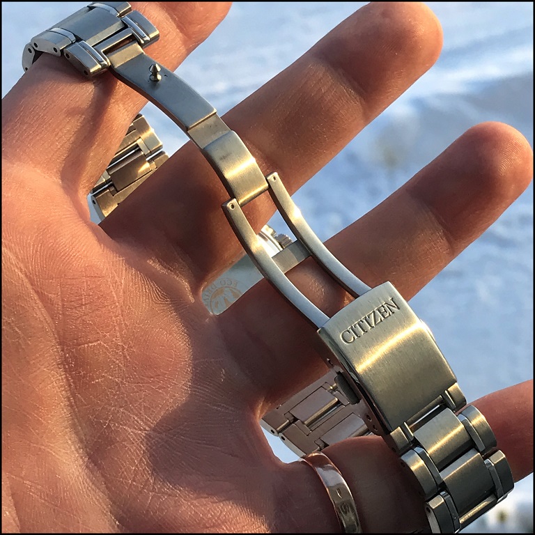Минус (или плюс) – достаточно тонкий и очень гибкий браслет. Мне стало удобно только когда я его подогнал почти вплотную, чтобы не болтался. К часам он подогнан идеально (что не всегда бывает даже у Хрономастера), но сами часы кажутся массивными в контрасте с ним. Плюс, что вес из-за этого значительно ниже, чем у массивных браслетов. Сталь не титан, – «приятный вес» приятен, до тех пор, пока он не надоедает. Этот вес меня не напрягает.